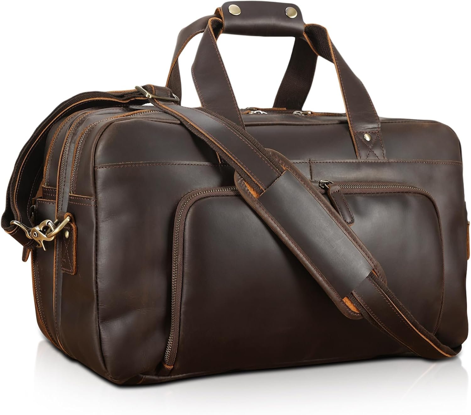 18″ Full Grain Leather Luggage Airlines Personal Item Bag Business Carry On Suitcase Overnight Travel Duffel Bag for Men (Dark Brown-18.5″)